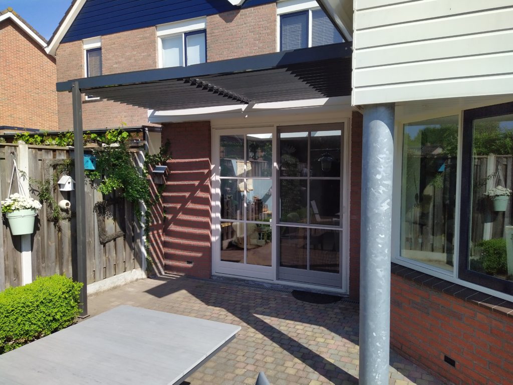 Om te de zon enigszins tegen te houden ontwierp en bouwde ik een slanke pergola annex zonnescherm. Deze heeft kantelbare lamellen en is volledig onderhoudsvrij door het gebruik van aluminium profielen, RVS bevestigingsmateriaal en kunststof lamellen en paal.